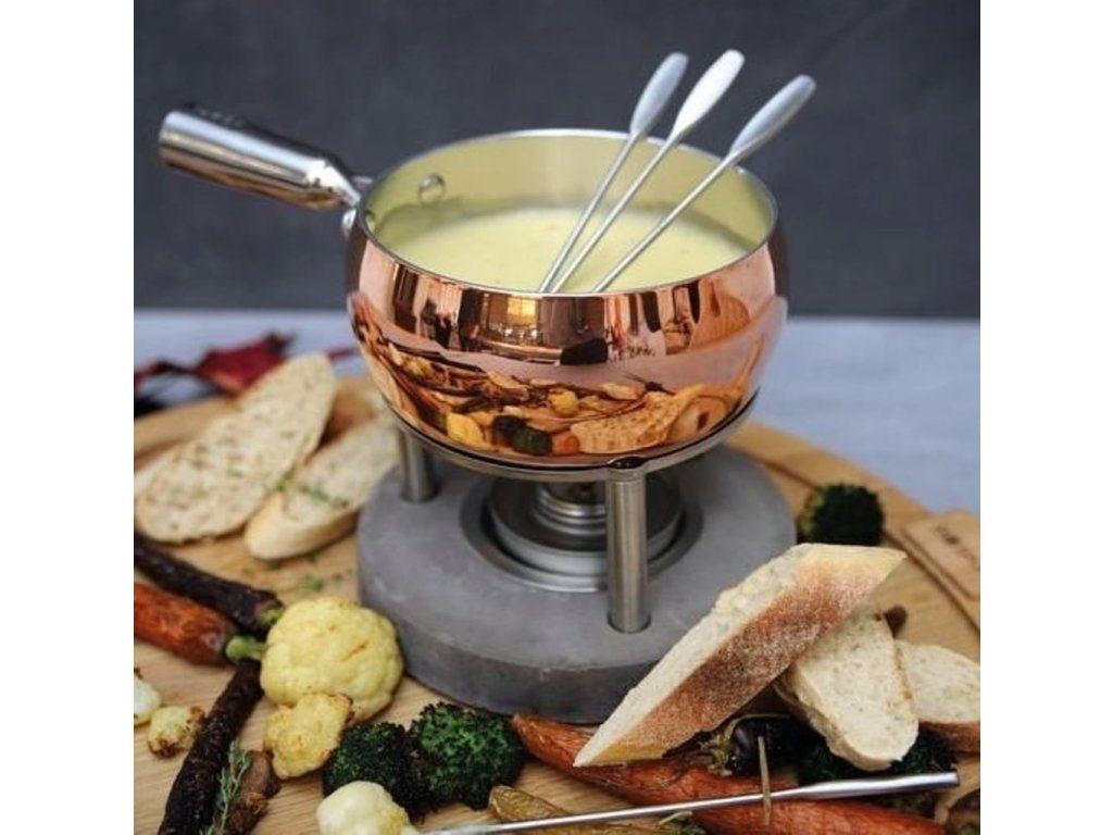 - Měděná nádoba s vynikající tepelnou vodivostí – fondue se ohřívá rovnoměrně.