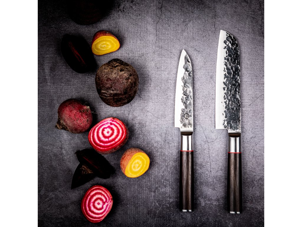 Nůž Santoku Nůž Santoku je japonská verze kuchařského nože. Slovo „santoku“ znamená „tři ctnosti“, odkazuje na tři použití nože: krájení, krájení na kostičky a krájení na jemno.