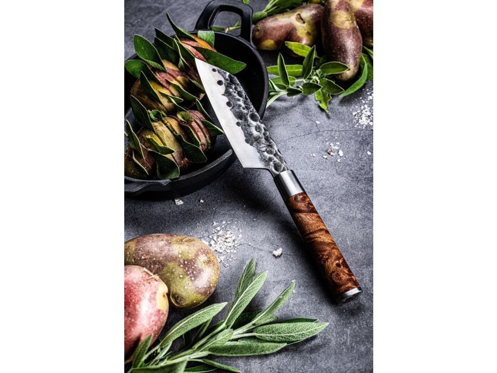 Každý nůž je ručně kovaný z japonské oceli 5Cr15Mov, s unikátní kresbou na čepeli a masivní rukojetí z olivového dřeva, která perfektně padne do ruky.