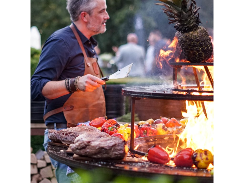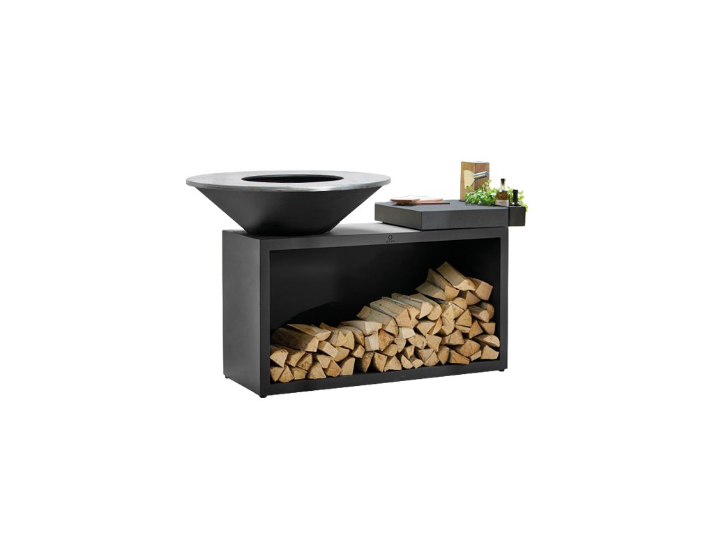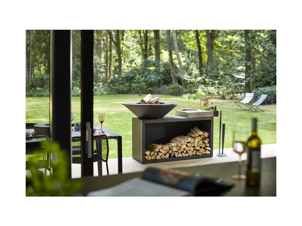Díky integrovanému úložnému prostoru na dřevo máte vše potřebné vždy po ruce a pracovní plocha poskytuje dostatek místa pro přípravu surovin i servírování. Výsledkem je funkční venkovní kuchyně, která spojuje design, praktičnost a radost z otevřeného ohně.