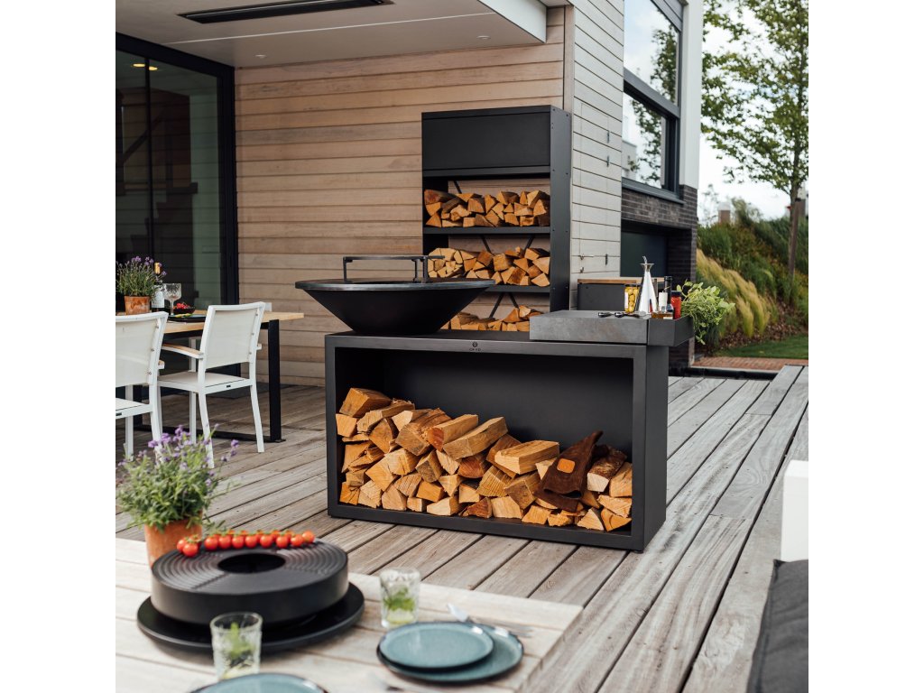 Grilovací plotna o průměru 100 cm nabízí dostatek prostoru pro práci s více teplotními zónami najednou – od prudkého opečení steaků přes pomalejší přípravu zeleniny až po jemné dokončování ryb nebo dezertů. Integrovaný prostor na dřevo udržuje vše přehledně po ruce a dotváří čistý architektonický vzhled celého ostrova.