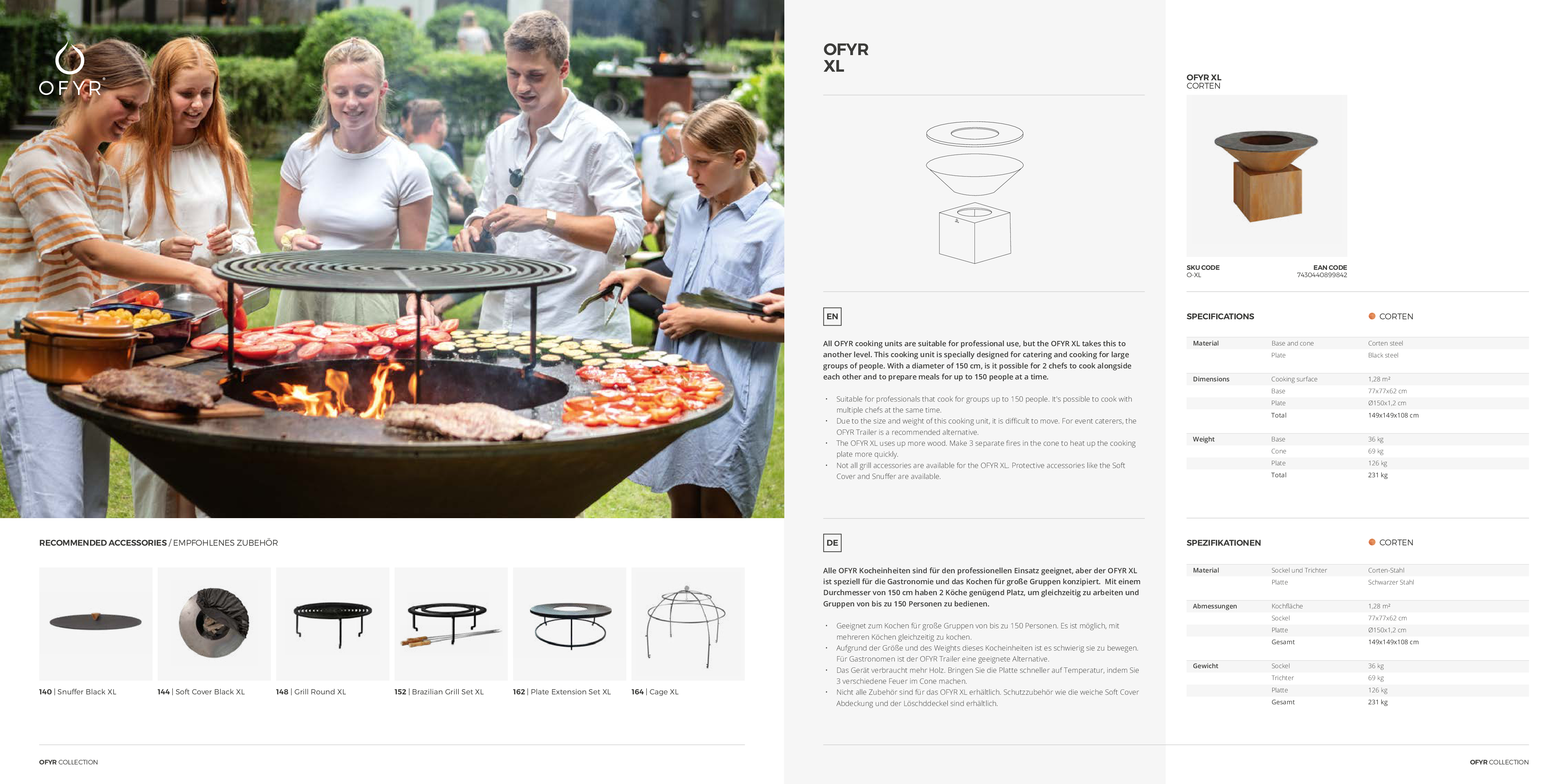 „OFYR XL je absolutní král mezi venkovními ohništi. Používáme ho při velkých akcích, cateringu a firemních eventech, kde se vaří pro desítky až stovky hostů. Největší výhodou je obrovská varná plocha a možnost práce více kuchařů současně. OFYR XL není jen gril, ale skutečné centrum dění.“ - Grill-Garden.cz