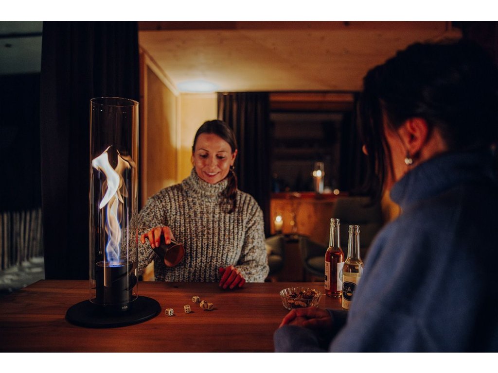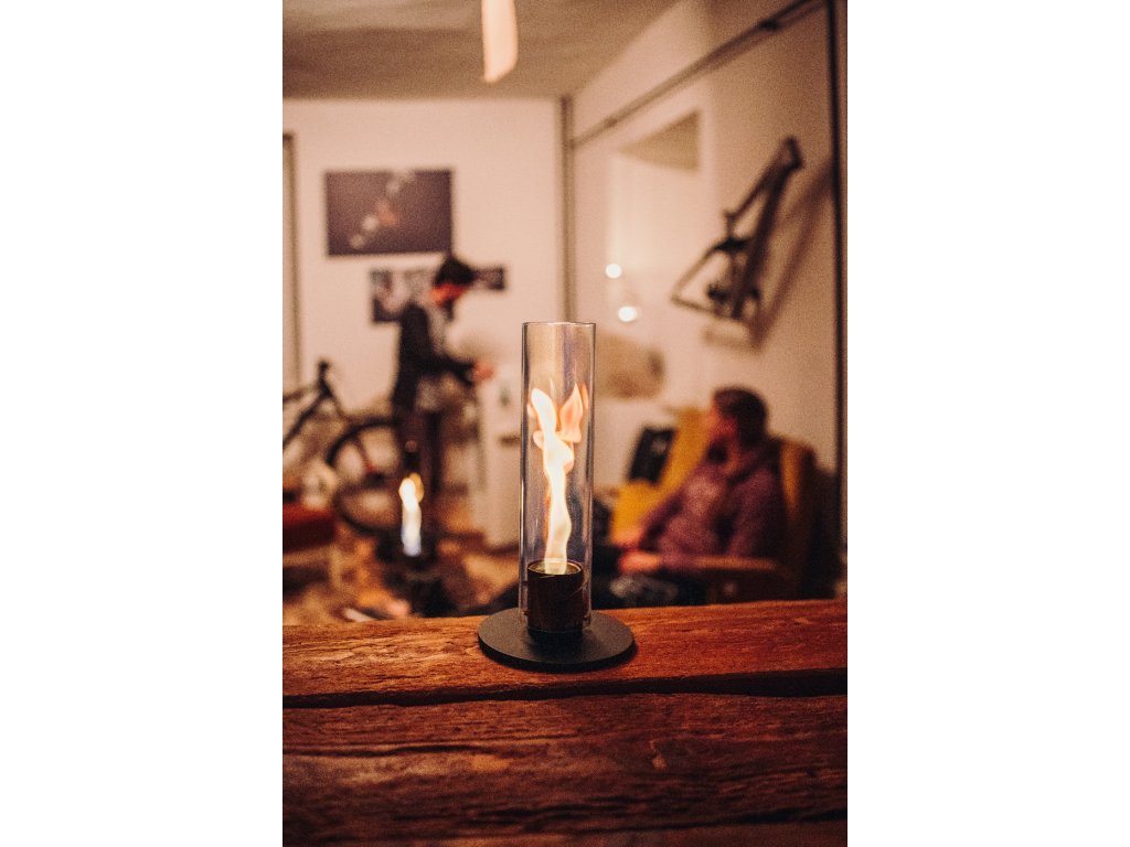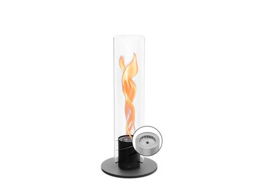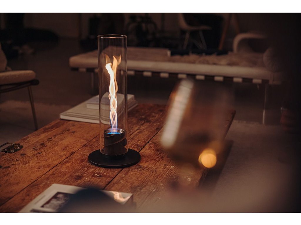 SPIN 1200 Black vytváří výjimečnou atmosféru živého ohně uvnitř vysokého borosilikátového válce, kde se plamen opticky vytáčí do spirály. Efekt vzniká díky sofistikovanému proudění vzduchu a působí jako přirozená světelná plastika – viditelná i ve dne.