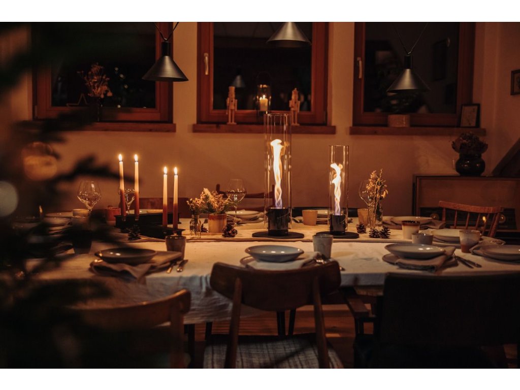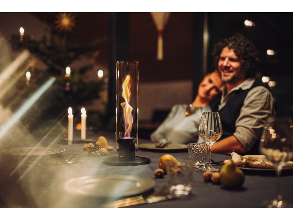 SPIN 1200 Black je designový stolní biokrb s rotujícím spirálovým plamenem uvnitř vysokého skleněného válce. Hoří na bioethanol bez kouře, sazí a zápachu a je bezpečný i pro interiér. Elegantní černé provedení působí moderně, industriálně a dokonale ladí s večerním stolováním, firemními eventy nebo designovými interiéry i terasami.