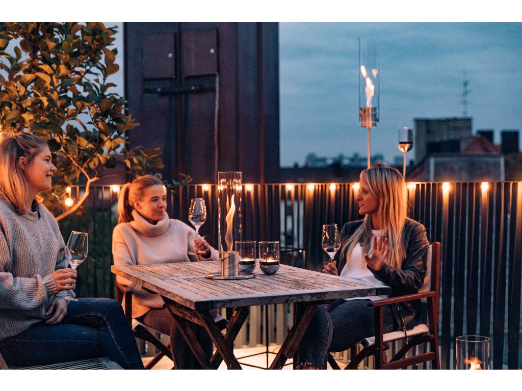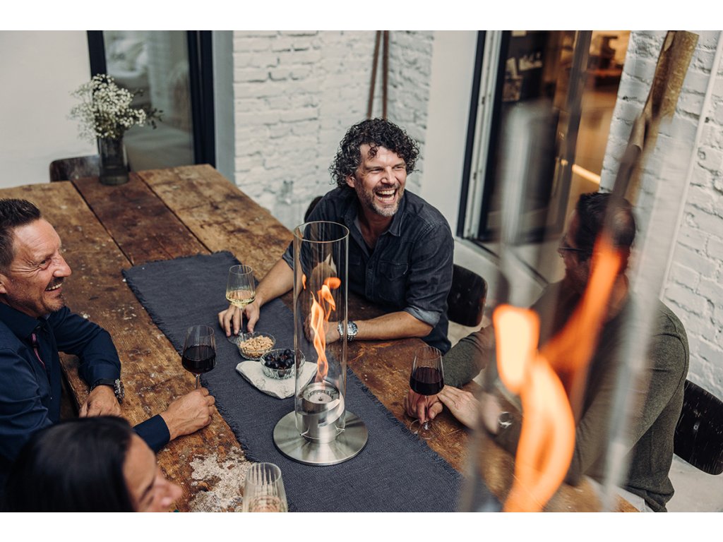 SPIN 1200 Silver je oblíbený pro designové stolování, eventy a večerní ochutnávky vín. Jeho vyšší válcová konstrukce a fascinující spirálový efekt jsou vidět i z dálky a nahrazují svíčky nebo stojací lampy – atmosféra je teplá, bezpečná a dokonale elegantní, a to jak v interiéru, tak na terase.