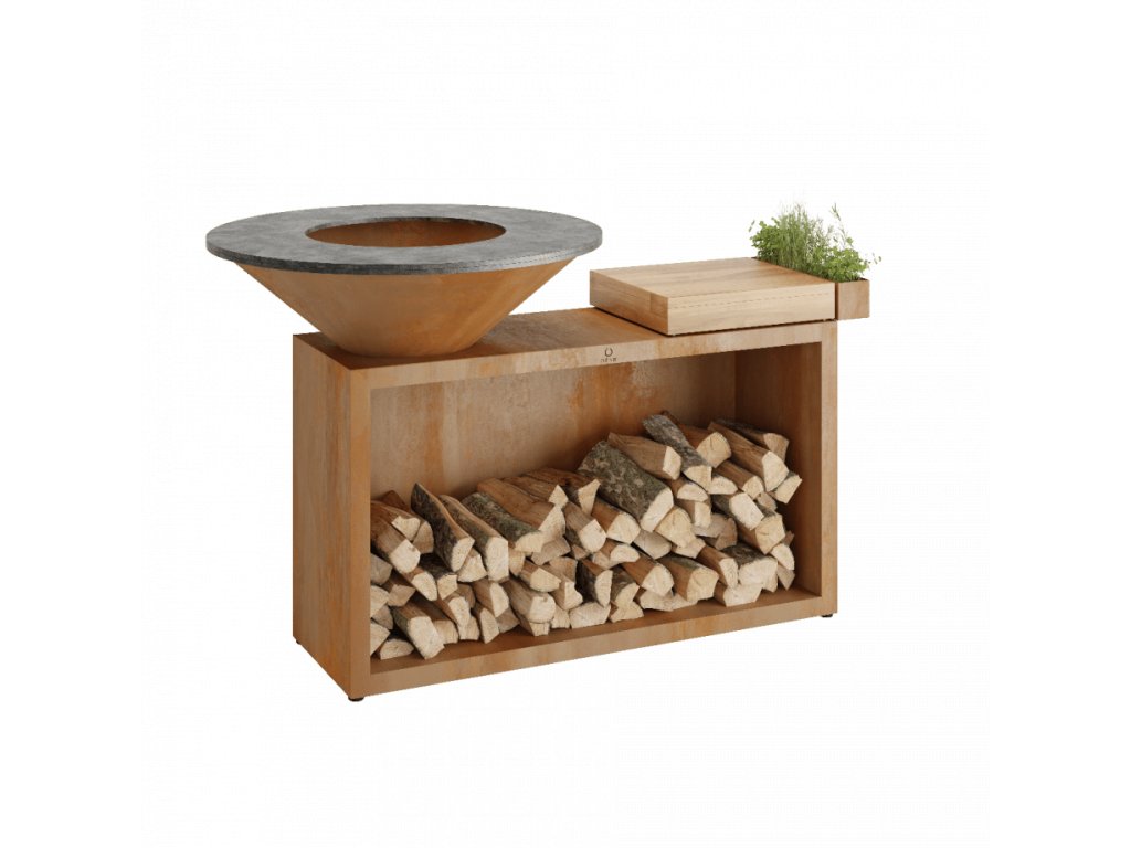 OFYR Island Corten 85 Teak Wood představuje kompletní řešení venkovního vaření v kompaktním a elegantním provedení. Masivní konstrukce z cortenové oceli je doplněna o teakovou pracovní desku, která slouží k pohodlné přípravě surovin, servírování i odkládání náčiní. Integrovaný úložný prostor na dřevo zajišťuje maximální praktičnost a zároveň dotváří čistý, symetrický vzhled celé sestavy.